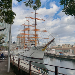 都心に急に船が出てきてビックリする。日本丸ヌケの観覧車かっこいい。