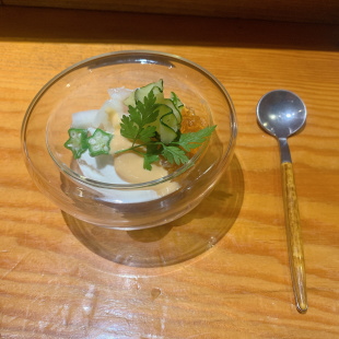 前菜のジャガイモのエスプーマ、ウニソース掛けと、煮凝りが出色。